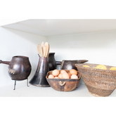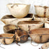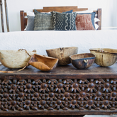 These beautiful symmetrically shaped bowls are made of hardwood and are both durable and multi-functional. They are decoratively carved on the outside with geometrical shapes. Some cracks or holes in the bowls are repaired with pieces of metal which are hammered on the wood and decorated with patterns. These repairs add to the aesthetic appeal of the bowl.