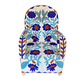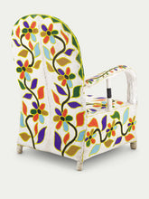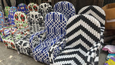 They are handcrafted by attaching thousands of tiny glass beads to canvas fabric in beautiful shapes and designs. The fabric is then attached to the chair frame. Each chair is a truly a unique work of art and they surprisingly comfortable too.