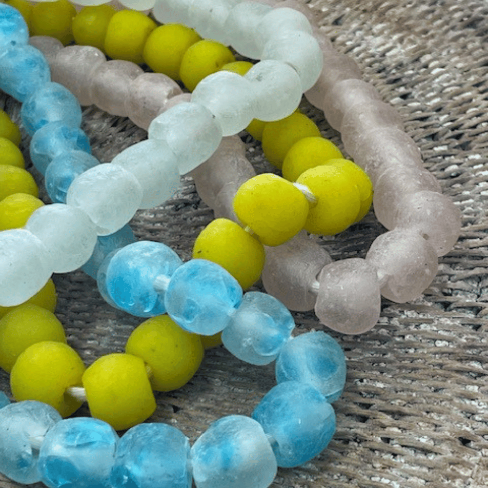 African recycled glass beads are made by members of the Krobo Tribe which is located in Ghana, Africa.