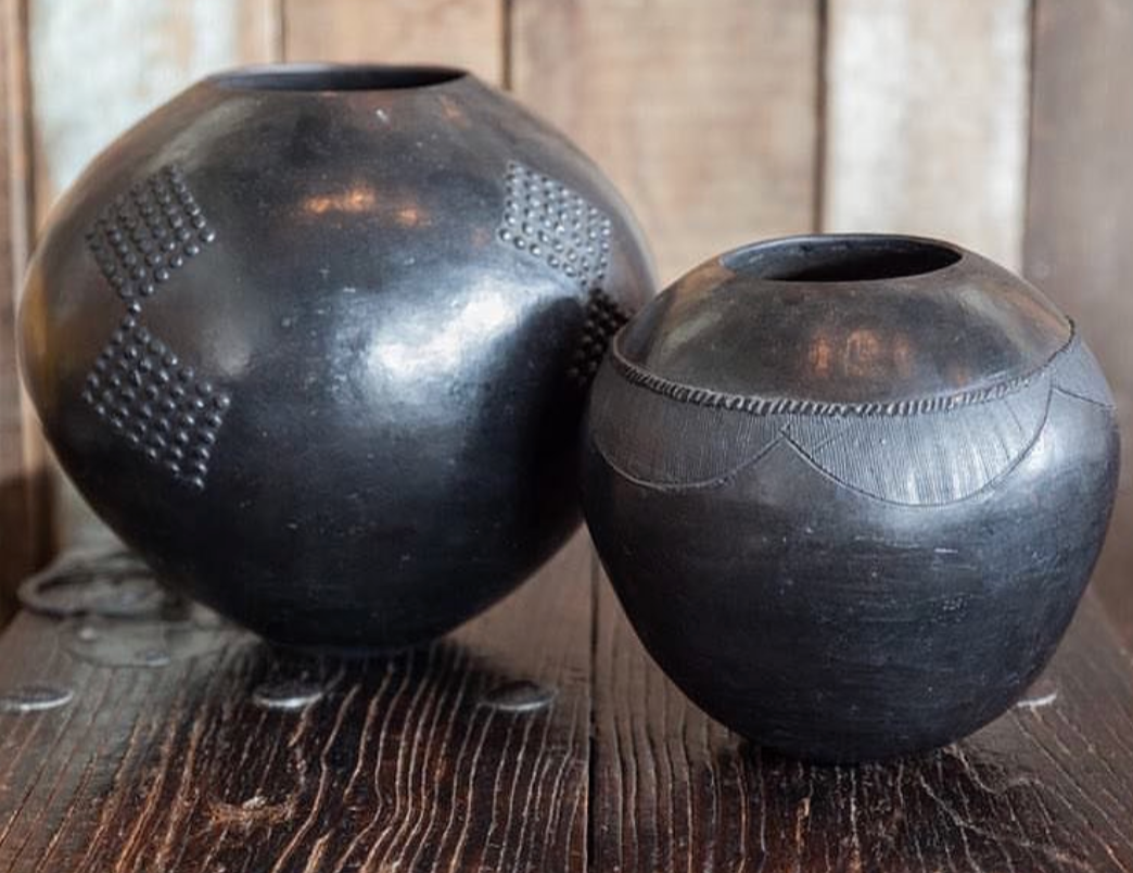 These black pots are then polished to fine sheen. Each pot is unique and they are available in a variety of sizes to make a strong decorative statement.
