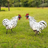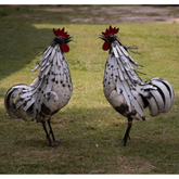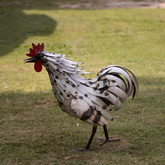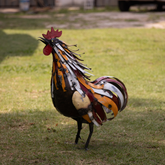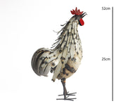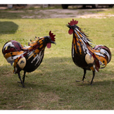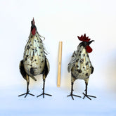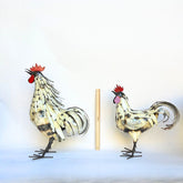 Metal Chicken/ Rooster sculptures created by skilled artisans in Africa from scrap metal. These eco sculptures will add a touch of charm to any garden. They are available in White with a red beak and a Multi Coloured variant featuring brown, yellow, red and white feathers.